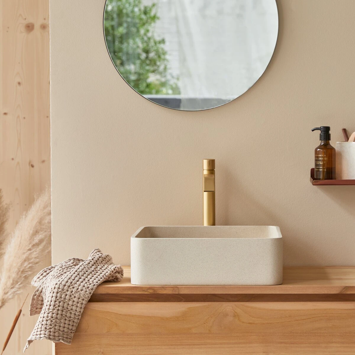 Beaucoup de charme pour la vasque carrée Thaïs en terrazzo cream ! On aime l’effet terrazzo apporté par son aspect moucheté du plus bel effet, sa matière très appréciée des designers et ses lignes adoucies. Son design épuré permet de l’associer à tout type d’ameublement : en un clin d’œil, c’est l’atmosphère de la pièce qui se métamorphose.